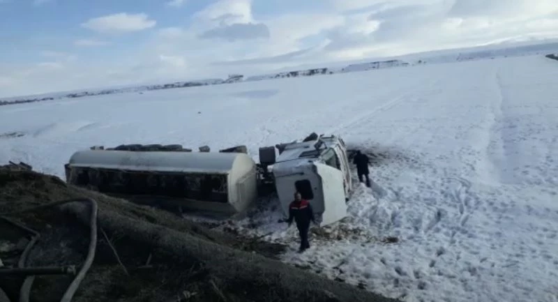 Ağrı’da kayganlaşan yolda kontrolden çıkan yakıt yüklü tır devrildi.