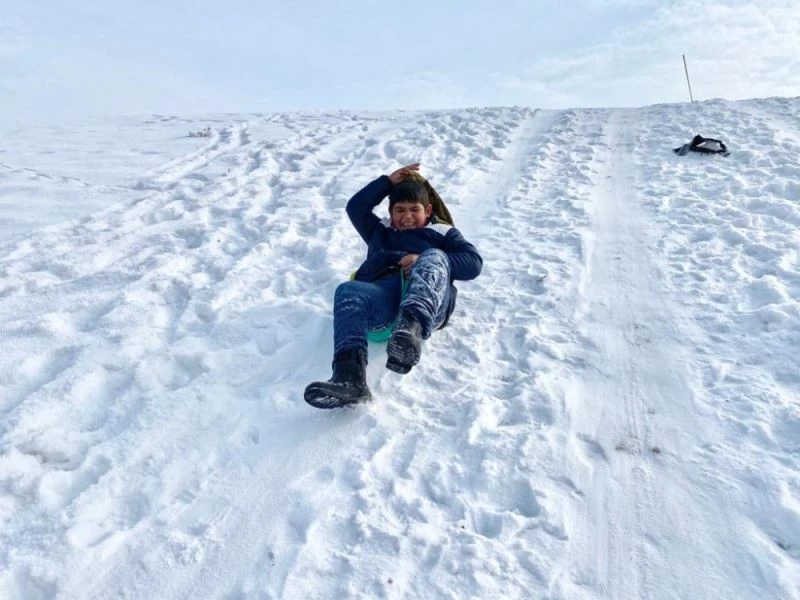Ağrı’da çocuklar, kendilerince oluşturdukları kayak pistinde poşet üzerinde kayarak doyasıya eğlendi.