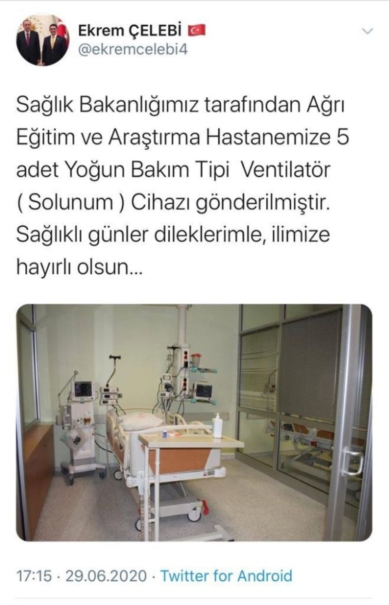 Milletvekili Çelebi, sosyal medya hesabından yaptığı paylaşımda, ”Sağlık Bakanlığımız tarafından Ağrı Eğitim ve Araştırma Hastanemize 5 adet yoğun bakım tipi ventilatör (solunum) cihazı gönderilmiştir. Sağlıklı günler dileklerimle, ilimize hayırlı olsun” dedi.