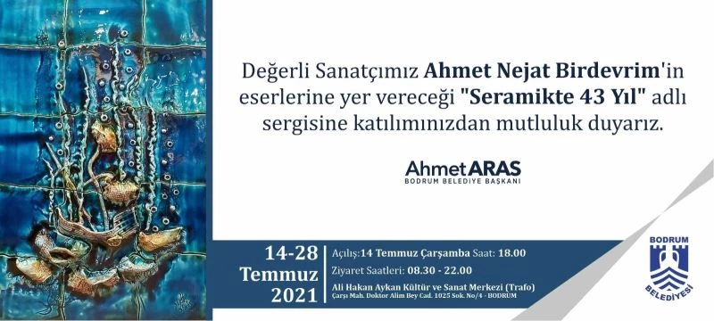 Seramik Sanatçısı Ahmet Nejat Birdevrim’in ’Seramikte 43 Yıl’ adlı kişisel sergisi, Bodrum Belediyesi’nin destekleriyle Trafo Bodrum-Hakan Aykan Kültür ve Sanat Merkezi’nde açılıyor. Sergi 14-28 Temmuz tarihleri arasında sanatseverlerle buluşacak.