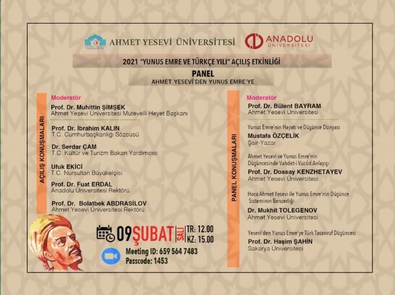 Anadolu Üniversitesi ve Ahmet Yesevî Üniversitesi’nin ortak düzenlediği “2021 Yunus Emre ve Türkçe Yılı Açılış Etkinliği, Ahmet Yesevî’den Yunus Emre’ye Paneli” 9 Şubat Salı günü Türkiye saati ile 12:00’de, Kırgızistan saati ile 15:00’te çevrimiçi olarak düzenlenecek.
