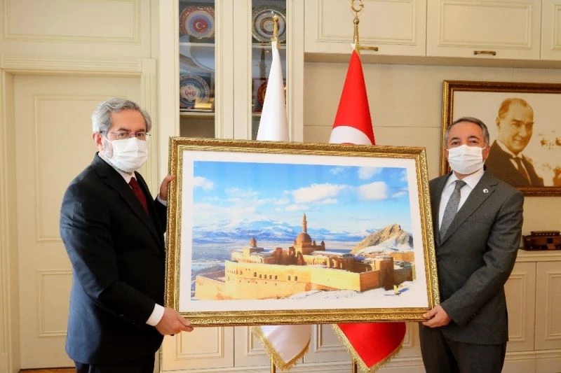 YÖK’ün genç üniversiteler ile deneyimli üniversiteleri bir araya getirdiği Anadolu Projesi kapsamında paydaş olan AİÇÜ ile Ankara Üniversitesi arasındaki üçüncü toplantı için Ağrı’ya gelen Ankara Üniversitesi Rektörü Prof. Dr. Necdet Ünüvar ile Proje Koordinatörü Rektör Yardımcısı Prof. Dr. Hicabi Kırlangıç ve Rektör Danışmanı Ümmet Artuç, AİÇÜ Rektörü Prof. Dr. Abdulhalik Karabulut tarafından misafir edildi. Ankara Üniversitesi Rektörü Prof. Dr. Ünüvar, Prof. Dr. Karabulut’u AİÇÜ Rektörlüğüne yeniden atanmasından dolayı tebrik ederek, başarılarının devamını diledi.