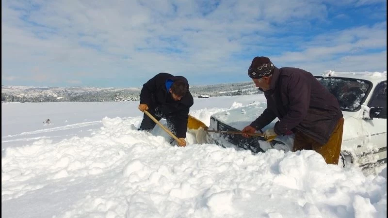 Yayladaki ailesine yardıma giden kişi karda aracıyla mahsur kaldı. 1 metreyi bulan kar yığını altında kalan araç 4 gün sonra yolların açılmasıyla çıkarıldı.