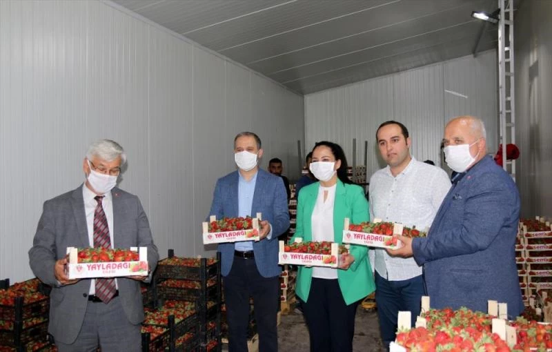 Ilçe merkezindeki çilek bahçelerini de gezen Özel ve Çelik, burada üreticilerle görüstü.