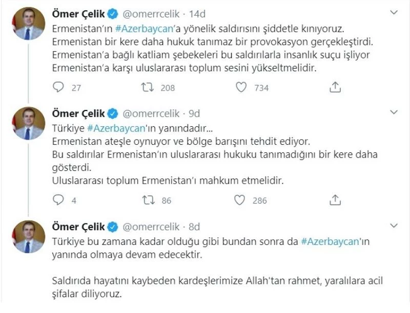 Sosyal medya hesabından açıklamalar yapan AK Parti Sözcüsü Ömer Çelik, “Ermenistan’ın Azerbaycan’a yönelik saldırısını şiddetle kınıyoruz. Ermenistan bir kere daha hukuk tanımaz bir provokasyon gerçekleştirdi. Ermenistan’a bağlı katliam şebekeleri bu saldırılarla insanlık suçu işliyor Ermenistan’a karşı uluslararası toplum sesini yükseltmelidir. Türkiye Azerbaycan’ın yanındadır. Ermenistan ateşle oynuyor ve bölge barışını tehdit ediyor. Bu saldırılar Ermenistan’ın uluslararası hukuku tanımadığını bir kere daha gösterdi. Uluslararası toplum Ermenistan’ı mahkum etmelidir. Türkiye bu zamana kadar olduğu gibi bundan sonra da Azerbaycan’ın yanında olmaya devam edecektir. Saldırıda hayatını kaybeden kardeşlerimize Allah’tan rahmet, yaralılara acil şifalar diliyoruz” ifadelerini kullandı.