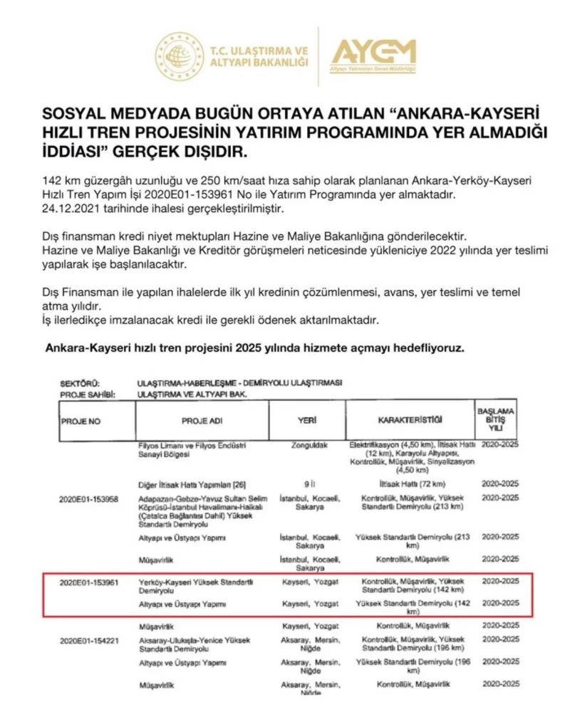 “Sosyal medyada bugün ortaya atılan "Ankara-Kayseri Hızlı Tren Projesi’nin yatırım programında yer almadığı iddiası" gerçek dışıdır. 142 km güzergah uzunluğu ve 250 km/saat hıza sahip olarak planlanan Ankara-Yerköy-Kayseri hızlı tren işi 2020E01-153961 no ile yatırım programında yer almaktadır. 24.12.2021 tarihinde ihalesi gerçekleştirilmiştir. Dış finansman kredi niyet mektupları Hazine ve Maliye Bakanlığı’na gönderilecektir. Hazine ve Maliye Bakanlığı ve kreditör görüşmeleri neticesinde yükleniciye 2022 yılında yer teslimi yapılarak işe başlanılacaktır. Dış finansman ile yapılan ihalelerde ilk yıl kredinin çözümlenmesi, avans, yer teslimi ve temel atma yılıdır. İş ilerledikçe imzalanacak kredi ile gerekli ödenek aktarılmaktadır. Ankara-Kayseri Hızlı Tren Projesi’ni 2025 yılında hizmete açmayı hedefliyoruz.”