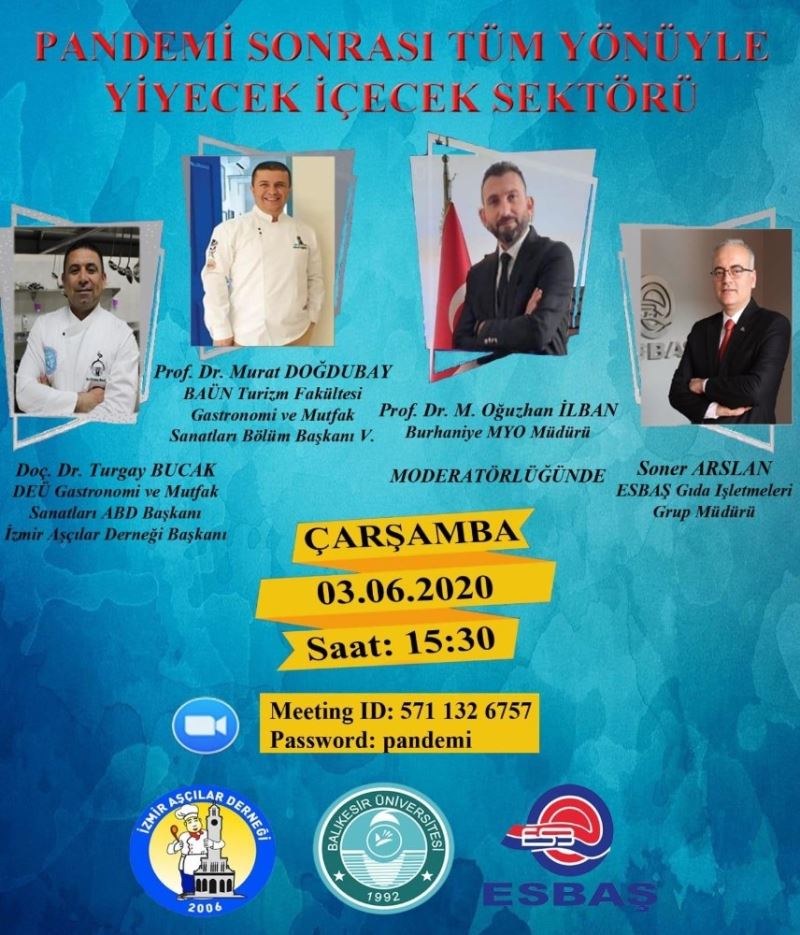 Prof.Dr. Mehmet Oğuzhan İlban, “Turizm sektöründe seyahat motivasyonlarının, uygulanacak tedbirlerin ve uygulamalarının nasıl olacağı vb birçok konunun tartışıldığı oturumda, katılım oldukça yoğun oldu. Yiyecek içecek sektörünün tüm yönleriyle ele alınacağı diğer bir oturumda da ESBAŞ Gıda İşletmeleri Gıda Müdürü Soner Arslan, Balıkesir Üniversitesi Turizm Fakültesi Gastronomi ve Mutfak Sanatları Bölüm Başkanı Prof. Dr. Murat Doğdubay ve İzmir Aşçılar Derneği Başkanı Dokuz Eylül Üniversitesi Turizm Fakültesi Gastronomi ve Mutfak sanatları Bölüm Başkanı Doç. Dr. Turgay Bucak katıldı. Yiyecek içecek sektöründe özellikle toplu yemek üretimi ile otel ve bağımsız restoranlarda uyulması gereken konular, önümüzdeki süreçte personeli ve sektörü bekleyen süreçlerin neler olabileceği tartışılan bu oturumda da bir çok soru yanıtlarını buldu. Bu süreçte turizm sektörüne yönelik yol haritasının çıkartılması, destinasyon yönetimlerinin turistin seyahat motivasyonlarının ve turist tiplerini takip etmesi, işletmelerin alması gerektiği önlemleri, yiyecek içecek sektörünün mönü planlama, hazırlama ve üretim süreçleri ile servis, hijyen kuralları ve kullanılan araç ve gereçlerde meydana gelebilecek değişikliklere dikkat çekti. Tatile çıkmayı düşünen vatandaşlarımıza yönelik de fiziksel mesafe kurallarına muhakkak uyulması gerektiğinin de hatırlatıldığı oturumlar, sağlıklı ve güvenilir bir turizm sezonu geçirilmesi dilekleriyle sona erdi” dedi.