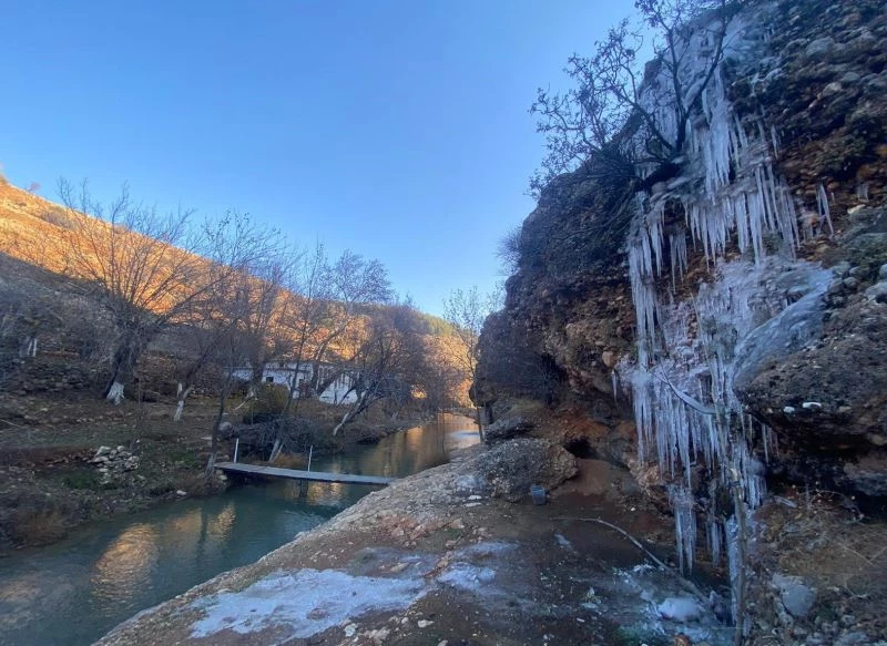 Adıyaman’da, havaların soğumasıyla birlikte kayalıklardan akan sular buz tuttu.
