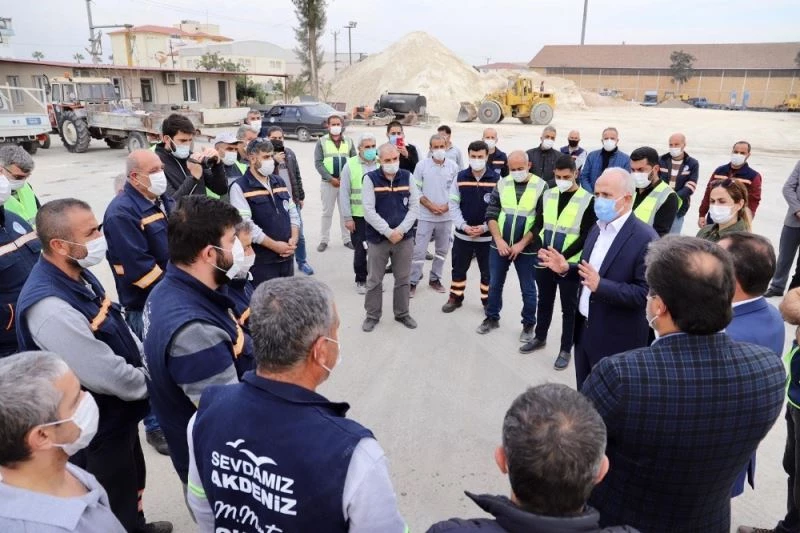Akdeniz Belediye Başkanı Muhammet Mustafa Gültak, belediyenin makine ikmal sahasında, korona virüs salgını ile mücadele eden, gece-gündüz demeden ilçe sınırlarında ilaçlama, dezenfekte ve temizlik çalışması yapan ekiplerle bir araya geldi. Burada, pandemi ile özverili mücadeleleri dolayısıyla işçilere teşekkür eden Başkan Gültak, sözünü verdiği 500 TL’lik nakdi pandemi desteğinin de belediye personelinin banka hesaplarına yatırıldığı müjdesini verdi.