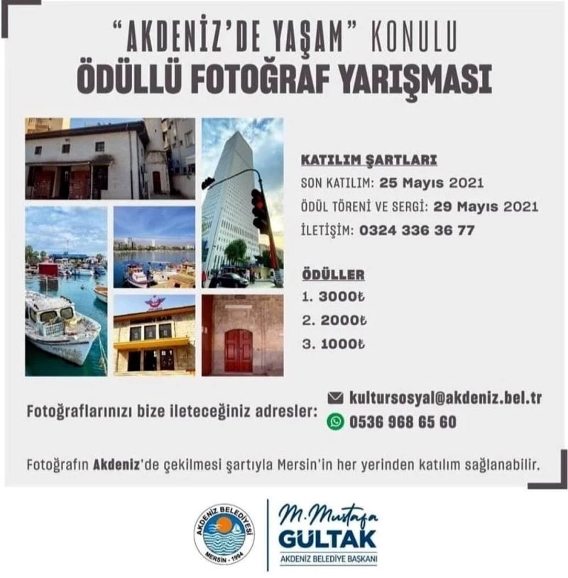 Akdeniz Belediyesi Kültür ve Sosyal İşler Müdürlüğü tarafından, düzenlenen "Akdeniz’de Yaşam" konulu ödüllü fotoğraf yarışmasının herkese açık olduğu son katılım tarihinin ise 25 Mayıs 2021 olduğu belirtildi. Yarışma kapsamında yapılacak jüri değerlendirmesi sonucunda, birinci gelen fotoğraf sahibine 3 bin TL; ikinciye 2 bin TL; üçüncüye de bin TL ödül verileceği kaydedildi. Yarışmaya katılmak isteyenler, değerlendirmeye alınmasını istedikleri fotoğraflarını, “kultursosyal@akdeniz.bel.tr” adresine veya "05369686560" numaralı telefon ile Whatsapp üzerinden gönderebileceği aktarıldı. Dereceye giren fotoğrafların sergileneceği ödül töreninin ise 29 Mayıs 2021 tarihinde yapılacağı belirtildi.