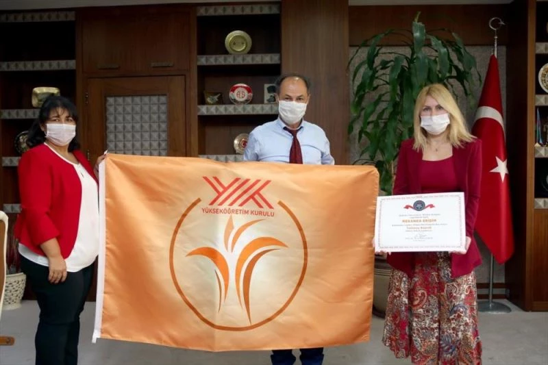 Kovid-19 tedbirleri kapsaminda video konferans yoluyla gerçeklestirilen ödül töreni sonrasi Akdeniz Üniversitesi Rektörlügü'nde bayrak takdim töreni yapildi.
