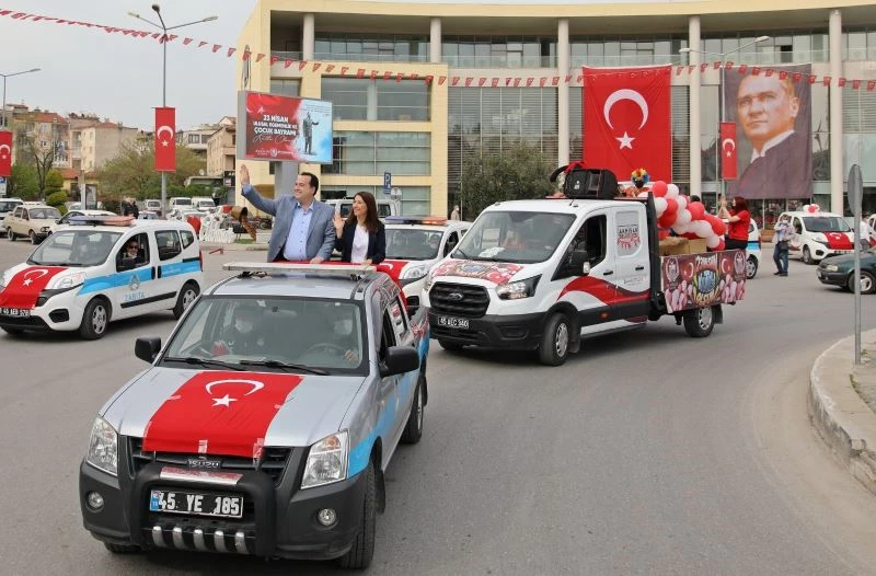 Kutlama etkinlikleri kapsamında Akhisar Belediyesi tarafından 23 Nisan görselleri, bayrak ve balonlarla donatılan 3 aracın üzerinde çizgi film kahramanlarından oluşan maskotlar yer aldı. Araçların arkasında Akhisar Belediyesi ekiplerinin bulunduğu onlarca araçlar şarkı ve marşlar eşliğinde kentin cadde ve sokaklarında tur attı.