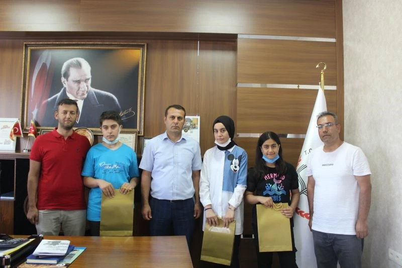 İlçe Milli Eğitim Müdürü İbrahim Halil Tunçmen, Şehit Yunus Uğur Anadolu Lisesi 9. Sınıf öğrencilerinden Muhammed Baylan ve Melek Nida Öner ile Kahta İmam Hatip Ortaokulu 5. Sınıf Öğrencisi Meryem Ceren Özen’e hediyelerini takdim etti.