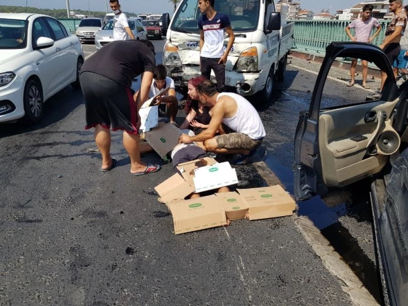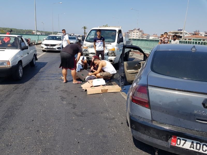 Antalya’nın Manavgat ilçesi Çevreyolu köprüsünde bariyerlere çarpıp ters yöne dönen otomobile, arkadan gelen kamyonet çarptı. Kazada, akraba olan iki sürücü yaralandı.