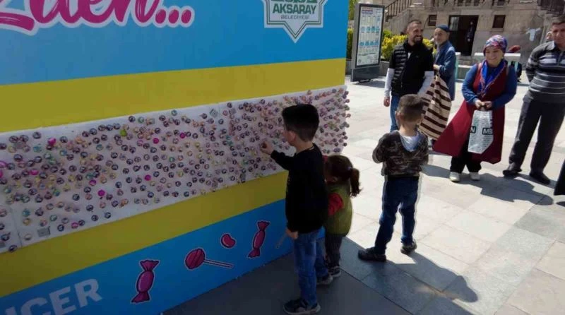 Çocukların bayram sevincine ortak olmak amaçlı 15 Temmuz Milli İrade Meydanına stant kuran Aksaray Belediyesi, pano şeklinde kurulan standa çubuklu şekerler bıraktı. Aileleriyle birlikte bayram alışverişine çıkan çocuklar panodaki şekerleri görünce sevinçle panoya koştu. İlk bayram şekerlerini belediyeden alan çocuklar ve aileleri Belediye Başkanı Evren Dinçer’e teşekkür etti. Çocuklar başta olmak üzere genci yaşlısı şeker stantlarından şeker ikramını geri çevirmedi.