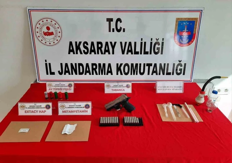 Edinilen bilgiye göre, uyuşturucuyla mücadele çerçevesinde çeşitli çalışmalar yapan İl Jandarma Komutanlığı ekipleri, 1 şahsın uyuşturucu madde imal ve ticareti yaptığı bilgisine ulaştı. Kimliği belirlenen şüpheliyi Aksaray Cumhuriyet Başsavcılığı koordinesinde takibe alan Jandarma Suç Araştırma (JASAT) timi ve jandarma asayiş ekipleri 2 gün yapılan takibin ardından şüpheliye yönelik operasyon düzenledi. Şüphelinin içinde bulunduğu aracı durduran jandarma ekipleri, araçta ve şüphelinin üzerinde yaptığı aramada 3 gram metamfetamin, 5 adet uyuşturucu veya uyarıcı madde kullanma aparatı, 1 adet ruhsatsız tabanca, 98 adet tabanca fişeği, 5 adet av tüfeği fişeği ve uyuşturucu haplar ele geçirdi. Gözaltına alınan şüpheli sorgulanmak üzere İl Jandarma Komutanlığına götürüldü. Olayla ilgili soruşturma başlatıldı.