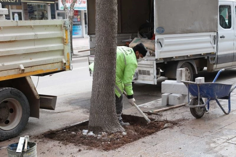 Belediye Başkanı Evren Dinçer’in göreve gelmesi ile birlikte başlatılan fidan dikme ve yeşil alanların artırılması seferberliği ile 2020 yılı içerisinde parklara, refüjlere ve yeşil alanlara toplamda 130 bin fidan dikimi gerçekleşmişti. Aksaray iklimine ve toprak yapısına uygun olan fidanların toprakla buluşması neticesinde kentin yeşil alan varlığında ciddi oranda artış yaşandı. Belediye ekipleri, Belediye Başkanı Evren Dinçer’in talimatları doğrultusunda toprakla buluşturulan her bir fidanın yeşermesi ve şehrin “Yeşil Aksaray” adı ile özdeşleşmesi adına dikilen fidanların ve ağaçların bakımını rutin olarak yapıyor. Aksaray Belediyesi ekipleri bakım çalışmaları kapsamında Necip Fazıl Kısakürek Caddesinde ve Selçuklu Parkta bulunan ağaçların yağmur ve kar yağışlarından daha fazla faydalanması için karo taşlarla alanlar yaptı. Karo taşlarla yapılan çalışma neticesinde ağaçlar hem yağmur ve kar yağışlarından faydalanırken hem de dış etkenlerden korunmuş olacak.