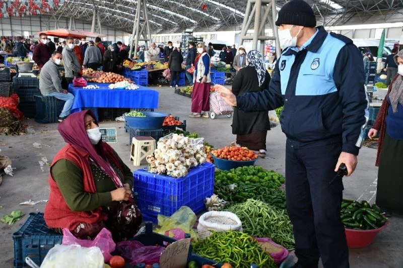 Aksaray’da korona virüs önlemleri kapsamında semt pazarlarında önlem alan zabıta ekipleri vatandaş ve pazarcıları hem uyarıyor, hem de maskelerini takıyor.