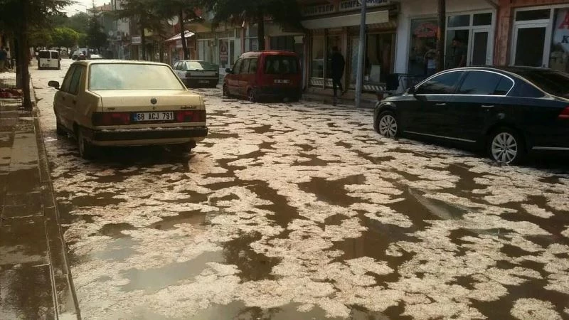 Aksaray’ın Ağaçören ilçesinde etkili olan dolu yağışı kısa sürede ilçeyi beyaza bürüdü.