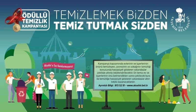 Akşehir Belediyesi kampanya kapsamında evlerinin ve iş yerlerinin önünü temizleyen, çevresinin ve sokağının temizliği konusunda hassasiyet gösteren vatandaşlar çekilişle altınla ödüllendirilecek. En temiz ev ve iş yerlerinin önü belirlendikten sonra çekilecek kura ile temizliğe hassasiyet gösteren vatandaşlar, altın ödülü kazanacak. Her ay yapılması planlanan çekişle Akşehir’deki evlerinin, iş yerlerinin önü ile sokakların daha temiz ve yaşanabilir bir hale getirilmesi planlanıyor.