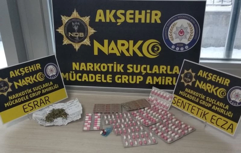 Edinilen bilgiye göre, Akşehir İlçe Emniyet Müdürlüğü Narkotik Suçlarla Mücadele Grup Amirliği ekipleri, yaptığı istihbarı çalışmalar kapsamında Konya plakalı araçla çevre illerden Akşehir’e uyuşturucu madde getirileceğini tespit etti. Takibe alınan araç, D-300 Karayolu üzerinde durduruldu. Araçta yapılan aramada 150 adet uyuşturucu hap, şahıslardan Y.İ.’nin evinde yapılan aramada ise 5 gram esrar ile 2 adet uyuşturucu hap ele geçirildi. Araç sürücüsü Y.İ. ile araçta bulunan F.A., O.Y. ve H.Y. isimli şahıslar gözaltına alındı.