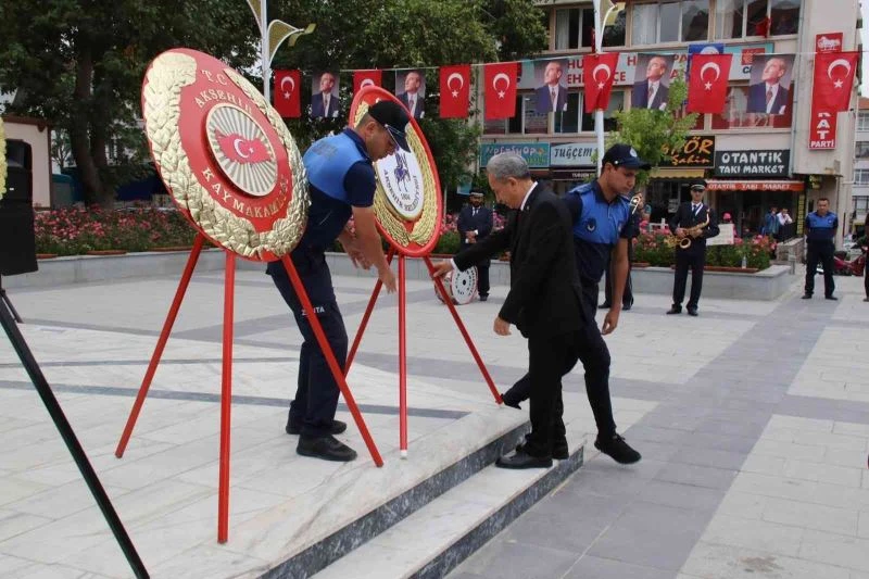 Cumhuriyet Meydanı’ndaki törende; Kaymakamlık, Garnizon Komutanlığı ve Belediye Başkanlığı çelenklerinin Atatürk Anıtı’na sunulmasından sonra saygı duruşunda bulunuldu ve İstiklal Marşı okundu. Akşehir Garnizon Komutanı Albay Tolga Yuvalı tarafından günün anlam ve önemini belirten bir konuşma yapıldı. Yuvalı yaptığı konuşmada, “Bugün her karışı şehit kanıyla sulanmış, mukaddes vatan topraklarının savunulması uğruna, canlarını feda etmeyi göze alarak gazilik unvanına erişen kahramanlarımızın kıvanç gününü kutlamanın derin heyecanını yaşıyoruz” dedi.