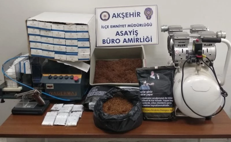 Akşehir İlçe Emniyet Müdürlüğü Asayiş Büro Amirliği ekipleri bir ihbarı değerlendirerek Nasreddin Mahallesi’nde bir evde kaçak tütün ve sigara doldurma makinesi bulunduğu, kaçak sigara satışı yapıldığı şüphesiyle belirlenen adrese operasyon düzenledi. Akşehir Cumhuriyet Başsavcılığından alınan arama kararı ile evde arama yapıldı. Aramada 1 adet sigara doldurma makinesi, 1 adet hava kompresörü, 10 bin 200 adet boş makaron, 320 adet doldurulmuş sigara, dört kilogram kaçak kıyılmış tütün ve bir adet kurusıkı tabanca ele geçirildi. Olayla ilgili gözaltına alınan A.K. isimli şahıs emniyetteki işlemlerinin ardından serbest bırakıldı.