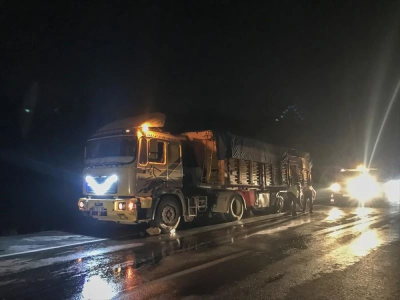 Alevleri fark ederek tiri yolun kenarina park eden sürücü, yangin söndürme tüpüyle yangina müdahale etti.