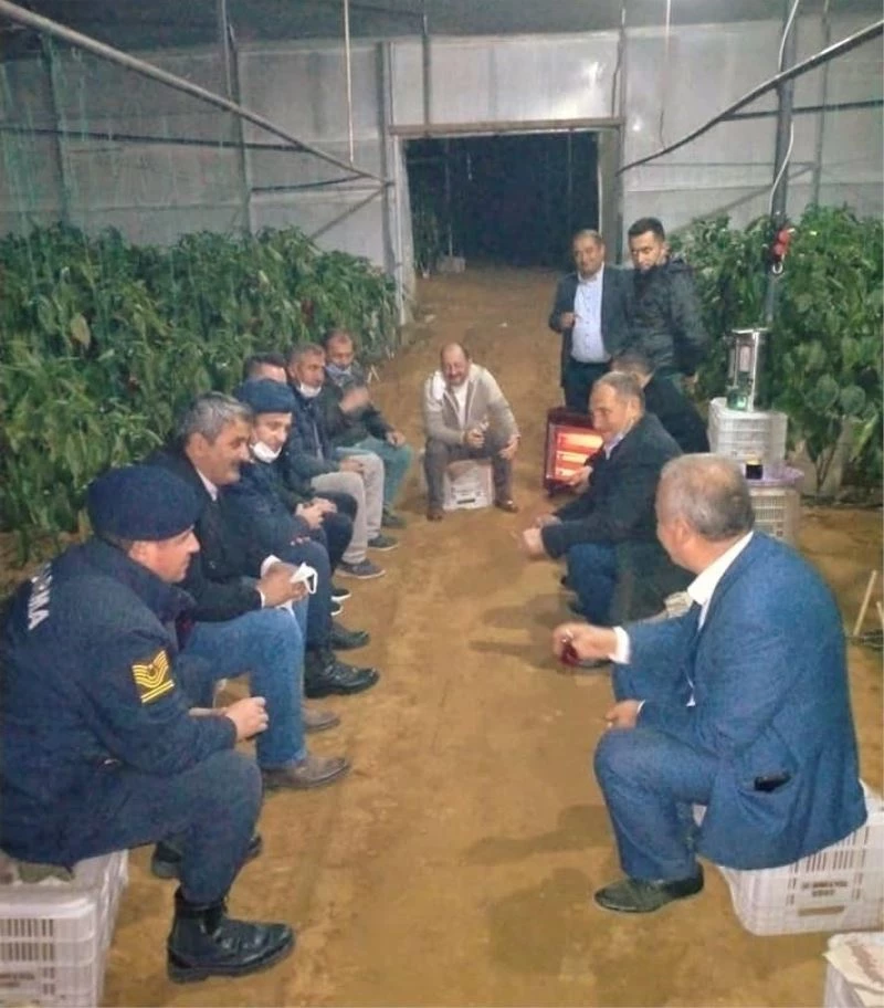 Aksu Belediye Başkanı Halil Şahin, Aksu Kaymakamı Aydın Ergün, İlçe Emniyet Müdürü Mehmet Tatar, İlçe Jandarma Komutanı Hulusi Mehmet Müdük ve Tarım İlçe Müdürü İhsan İnal ile birlikte zirai don nöbeti tutan üreticileri seralarında ziyaret edip sohbet etti.