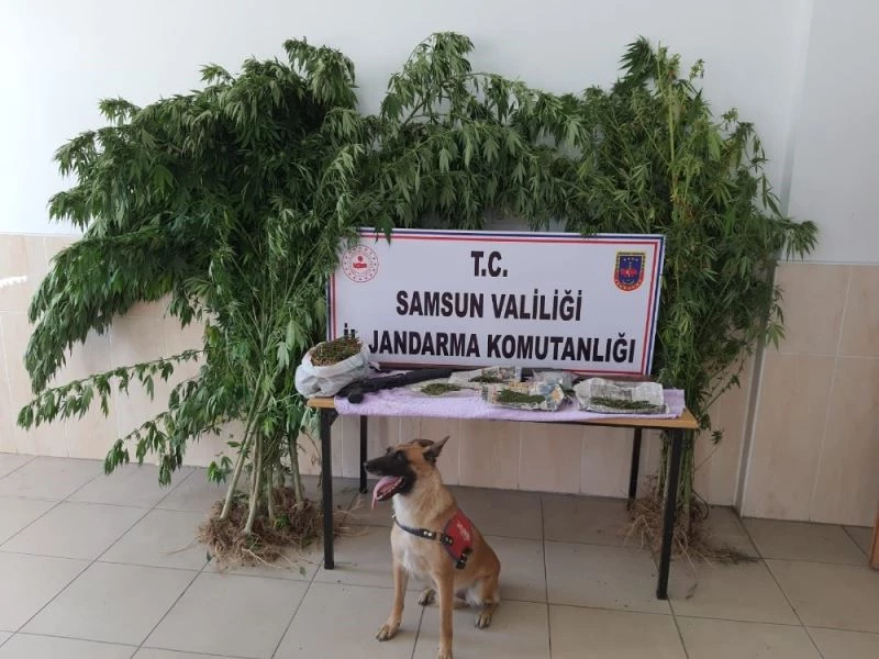 Samsun İl Jandarma Komutanlığı Kaçakçılık ve Organize Suçlarla Mücadele (KOM) Şube Müdürlüğü ekipleri ve Alaçam İlçe Jandarma Komutanlığı ekiplerince yapılan istihbari çalışmalar sonucunda Yenice Mahallesi’nde R.S’ye (56) ait evin bahçesinde narkotik dedektör köpeği ‘Ozon’ ile arama yapıldı. Yapılan arama neticesinde ekili vaziyette 57 kök kenevir, evde yapılan aramada da 500 gram kubar esrar, 1 adet seri numarasiz çift kırma av tüfeği ve 1 adet pompalı tüfek ele geçirildi. Şüpheli gözaltına alındı.