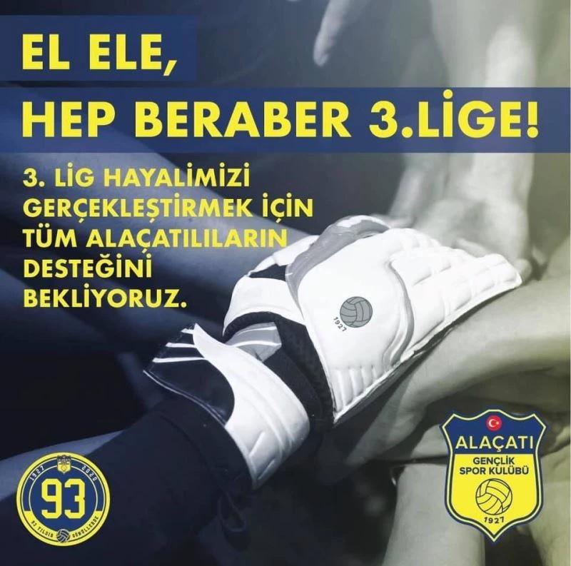 Çeşme’nin en eski spor kulübü olan, hedefini 3. Lig olarak belirleyen ve 94 yıllık tarihinde ilk defa profesyonel liglere bu kadar yaklaşan Alaçatı Gençlik ve Spor Kulübü’nden yapılan çağrıda, "Hedefimize, el ele vererek, hep beraber yürümek için maddi ve manevi desteklerinizi bekliyoruz" denildi.