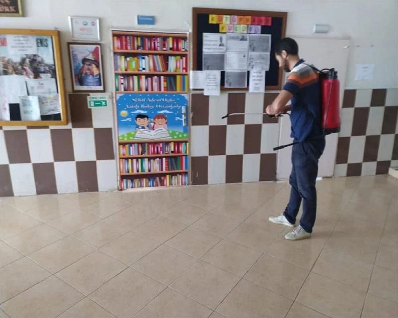 Kovid-19 tedbirleri kapsamında sınav merkezleri dezenfekte edilerek, okulun ve sınıfların kapıları ile öğretmen masalarına maske ve dezenfektan bırakıldı.