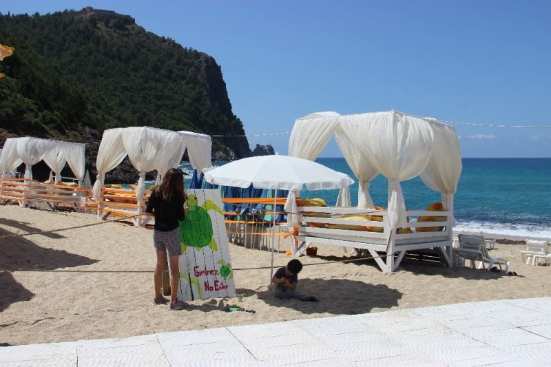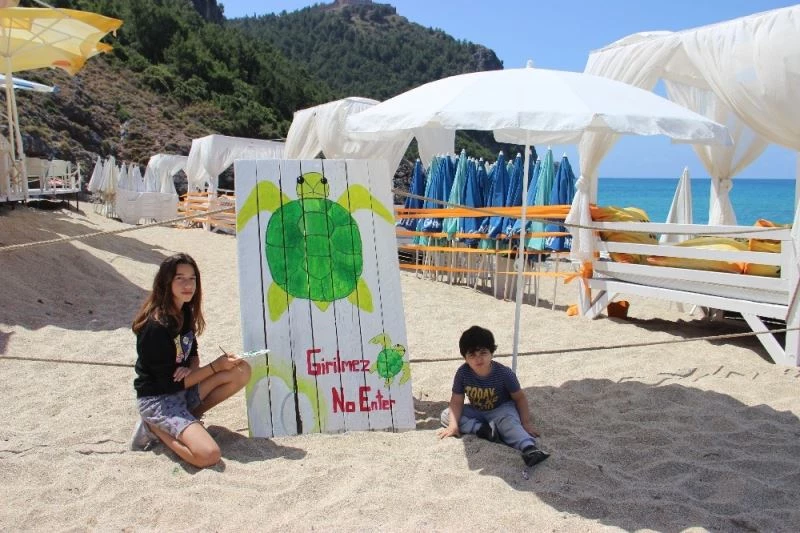 Antalya’nın Alanya ilçesinde 2 kardeş, sahile yumurtlayan caretta carettaların yuvasının zarar görmemesi için sevimli bir uyarı tabelası hazırladı. Tahta üzerine kendi elleriyle caretta caretta resmi çizen 2 kardeş, Türkçe ve İngilizce ‘girilmez’ yazısı yazarak yumurtaları koruma altına aldı.