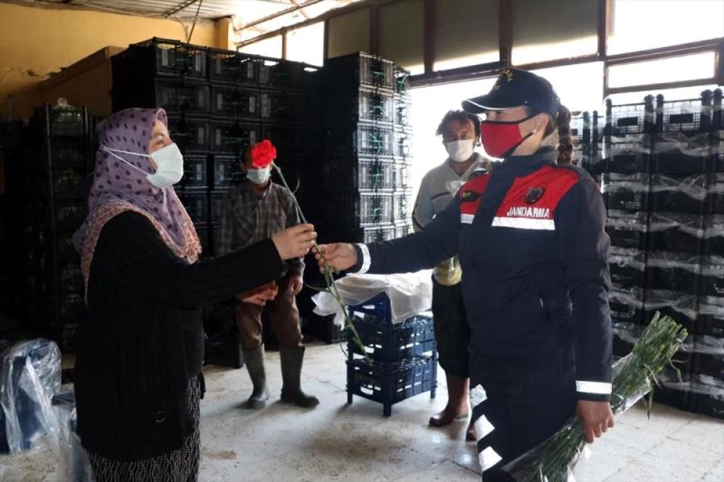 Mahmutlar Mahallesinde durdurdukları araçlardaki sürücü, esnaf ve yolda yürüyen kadınlara karanfil veren jandarma ekibine vatandaşlar da teşekkür etti.