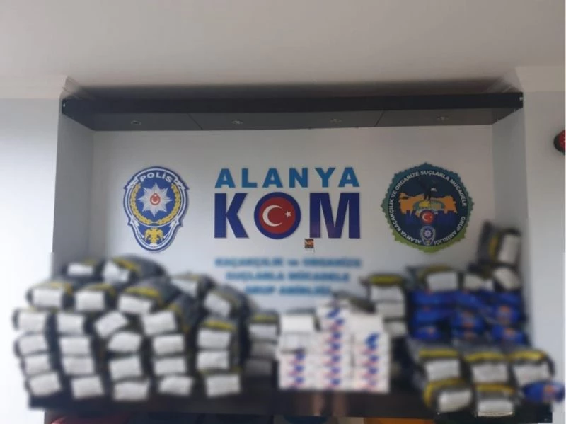 Alanya İlçe Emniyet Müdürlüğü Kaçakçılık ve Organize Suçlarla Mücadele Grup Amirliği ekipleri Şekerhane Mahallesi’ndeki bir işyerinde piyasaya kaçak tütün sürüldüğü bilgisi üzerine çalışma başlattı. Belirlenen adrese baskın düzenleyen polis, işyeri sahibi M.A.’ya ait 2 araçta 82 kilogram kaçak tütün ve kaçak tütünle doldurulmuş 5 bin 600 adet makaron ele geçirdi. Gözaltına alınan M.A. hakkında 5607 sayılı Kaçakçılıkla Mücadele Kanunu’na muhalefet etmek suçları kapsamında işlem yapıldıktan sonra savcılık talimatıyla serbest bırakıldı.