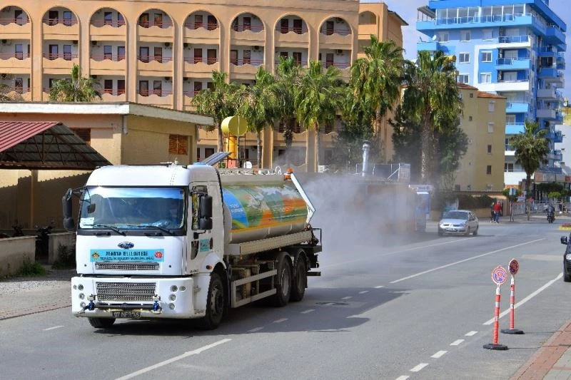 Alanya Belediyesi’nin Covid-19 ile mücadele kapsamında bünyesine kattığı mikronsis aracı, hafta sonu kısıtlamasında da Alanya sokaklarında dezenfeksiyon hizmeti vermeye devam ediyor.