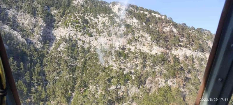 Antalya’da sarp bölgedeki ormanlık alanda çıkan yangına havadan müdahale ediliyor.