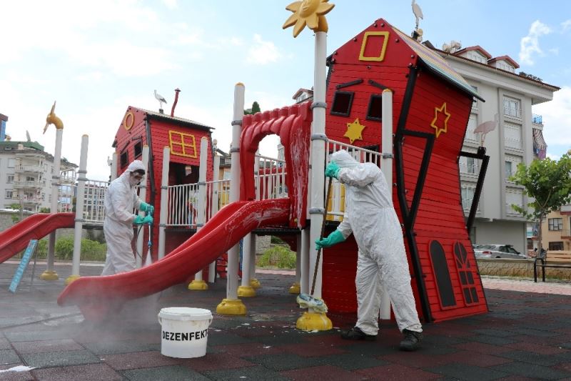 Alanya Belediyesi Park ve Bahçeler Müdürlüğü tarafından Alanya genelinde çocuk oyun parklarında temizlik ve dezenfekte çalışmaları yapılıyor.
