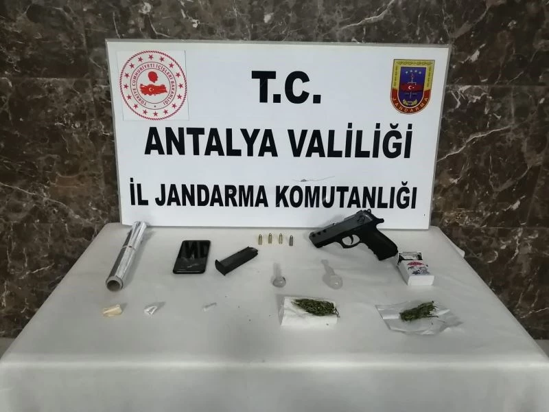 Alanya İlçe Jandarma Komutanlığı Kaçaklık ve Organize Suçlarla Mücadele (KOM) ekipleri, L.Y. isimli şüphelinin Mahmut Mahallesi’ndeki evinde uyuşturucu ticareti yaptığı bilgisine ulaştı. Bunun üzerine belirlenen adrese baskın düzenleyen jandarma yaptıkları aramalarda satışa hazır halde alüminyum folyo içerisinde toplam 4 gram metamfetamin, 7 gram esrar, ruhsatsız tabanca ve bu tabancaya ait 5 mermi ele geçirdi. Olayla ilgili adreste bulunan L.Y. ve R.K. isimli kadın gözaltına alındı. Karakoldaki işlemlerinin ardından R.K. savcılık talimatıyla serbest kalırken, L.Y. ise adliyeye sevk edildi.