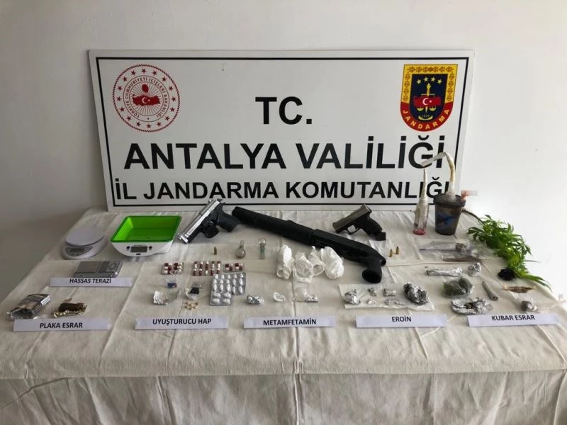 Şüphelilerin yapılan ev aramalarında; 3 adet hassas terazi, 7 gram eroin, 5 gram metamfetamin, 30 gram kubar esrar, 25 gram plaka esrar, 56 adet uyuşturucu hap, 1 kök kenevir bitkisi, 6 adet uyuşturucu kullanma aparatı, 2 adet ruhsatsız tabanca, 1 adet ruhsatsız av tüfeği ele geçirildi.