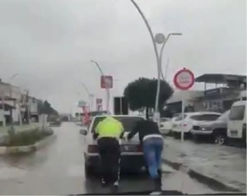 Zonguldak’ın Alaplı ilçesinde yolda kalan aracın imdadına trafik polisleri koştu.