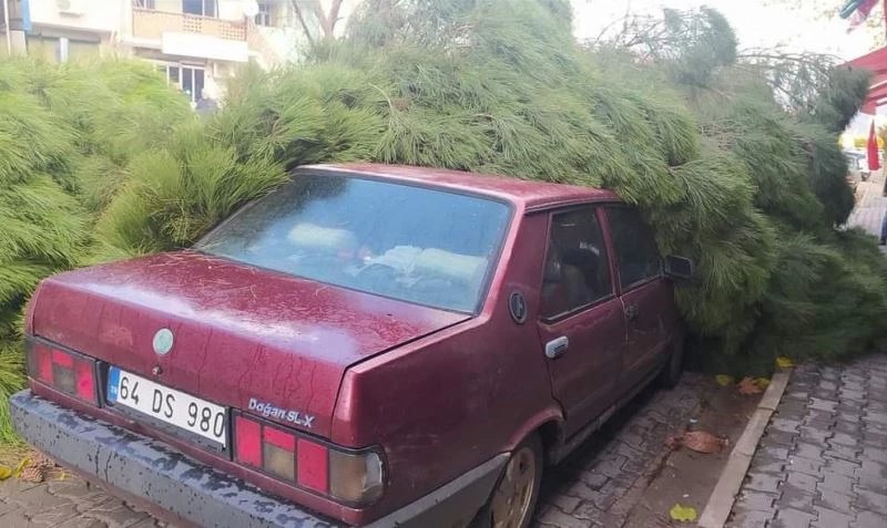 Alaşehir’de fırtına çam ağacını otomobilin üzerine devirdi