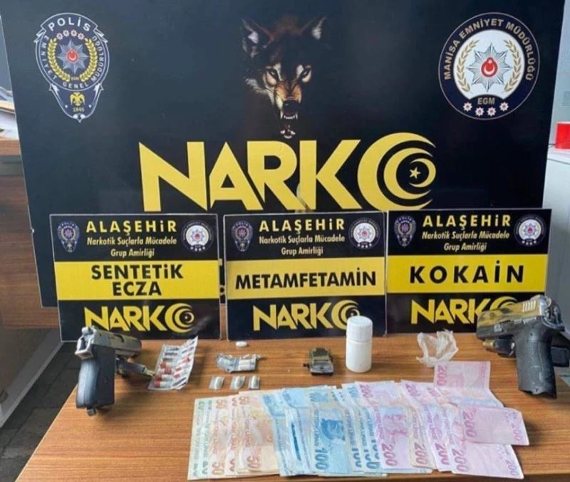 Manisa İl Emniyet Müdürlüğü Narkotik Suçlarla Mücadele Şube Müdürlüğü ve Alaşehir Narkotik Suçlarla Mücadele Grup Amirliği ekipleri uyuşturucu veya uyarıcı madde ticareti yapan, nakleden ve kullanan şahıslara yönelik yürütülen çalışmalarda 0,58 gram metamfetamin, 13 adet sentetik ecza, 2,1 gram taş kokain maddesi, 1 adet hassas terazi, 2 adet 9 mm ruhsatsız tabanca, 5 adet 9 mm fişek ve uyuşturucu madde ticaretinden elde edildiği değerlendirilen 4 bin 290 TL ele geçirildi. Operasyonda uyuşturucu veya uyarıcı madde imal ve ticareti yapmak suçundan gözaltına alınan 2 şüpheli sevk edildiği mahkemece tutuklanarak cezaevine gönderildi.