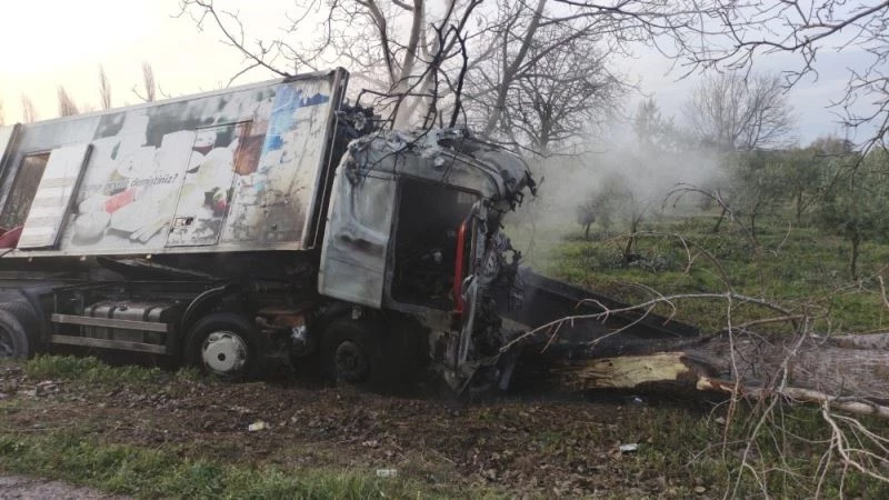 Bursa’da sebze yüklü bir kamyon yaşanan kazanın ardından yanmaya başladı. Alev topuna dönen kamyon küle dönerken, sürücü canını zor kurtardı.