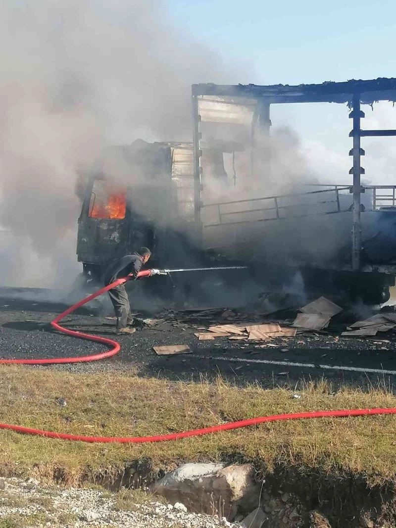 Ardahan’da henüz sebebi bilinmeyen bir nedenden dolayı bir tırda yangın çıktı. Hızla büyüyen alevler tırın gövde kısmını sararken yangın itfaiye ekiplerinin müdahalesi sonrası söndürüldü. Çıkan yangında tır kullanılamaz hale geldi.