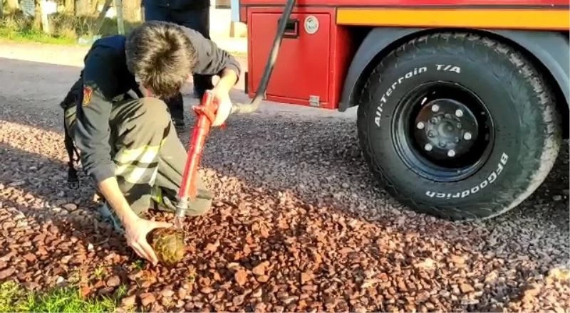 Alevler arasında kalan kaplumbağayı itfaiye kurtardı