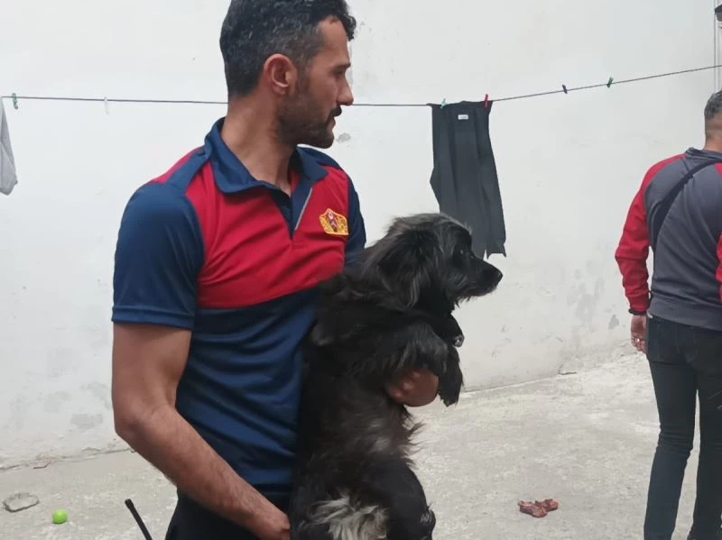 Adıyaman’da bir ikamette çıkan yangında, itfaiye ekipleri alevler arasında kalan köpeği son anda kurtardı.