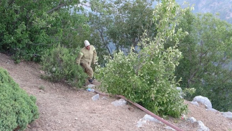 Salmanlı mevkiinde sarp arazide tüten bir kütüğü fark eden orman yangın söndürme işçisi ise tüten kütüğü karayoluna kadar indirerek ormanlık alandan uzaklaştırdı. O anlar kameralara yansırken, orman işçisi günlerdir yangınlara müdahale ettiklerini ve yaşlı bir kadını alevler arasından kurtardıklarını anlattı.