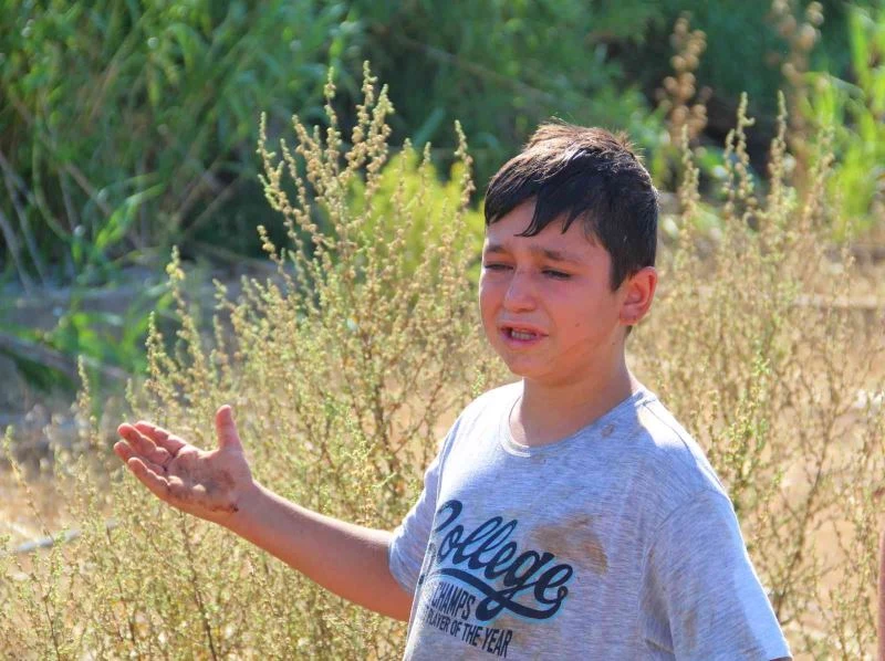 Antalya’nın Aksu ilçesinde kamışlı alanda başlayan yangın sera ve çok sayıda meyve ağacına zarar verdi. 11 yaşındaki Berat Çakır, hem yangını söndürmek için çabaladı hem de gördüğü manzara karşısında gözyaşlarını tutamadı.