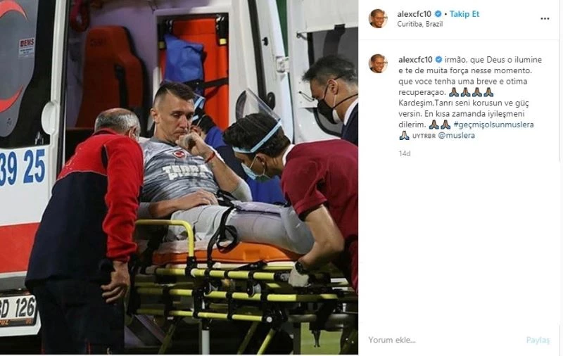 Bir dönem Fenerbahçe forması giyen Alex de Souza, dün Çaykur Rizespor maçında sakatlanan ve ayağında iki kırık meydana gelen Galatasaray’ın Uruguaylı kalecisi Fernando Muslera’yı unutmadı. Alex, sosyal medya hesabından Muslera için, "Kardeşim, Allah seni korusun ve güç versin. En kısa zamanda iyileşmeni dilerim" mesajını paylaştı.